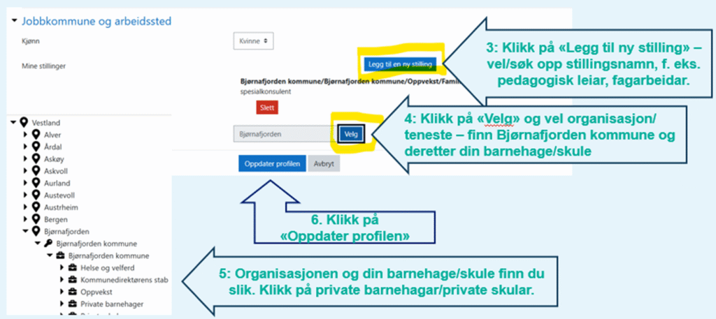 Tilsette i private barnehagar og skular må etter å ha logga inn på KS Læring via ID-porten med bruk av BankID følge stega under for å få tilgong til sjølve e-læringskurset:
