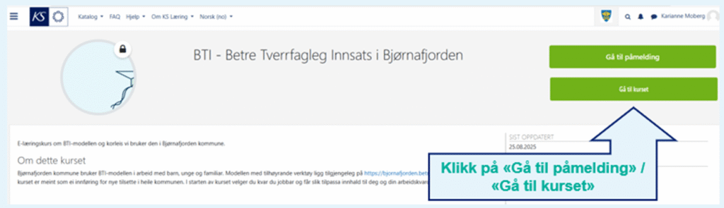 Dersom du har vore inne på e-læringskurset tidlegare står det «Gå til kurset». Klikk på «Gå til kurset», og du kjem direkte til sjølve e-læringskurset.