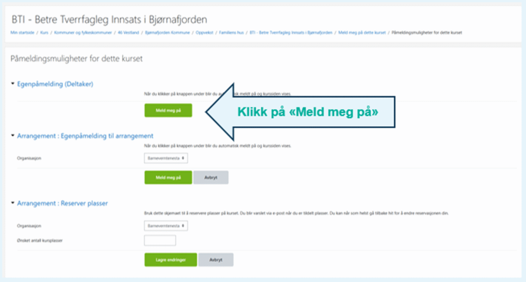Dersom du kjem til påmeldingssida, klikkar du på «Meld meg på» under «Egenpåmelding (Deltaker)».