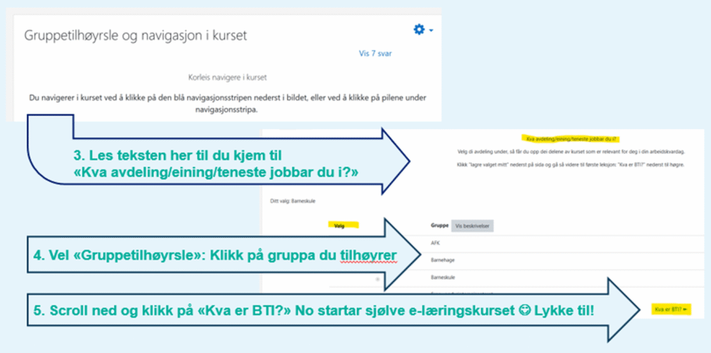 Følg stega under for å starte sjølve e-læringskurset «BTI – Betre Tverrfagleg Innsats i Bjørnafjorden kommune».