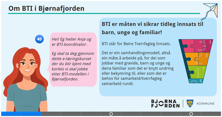 E-læringskurset «BTI – Betre Tverrfagleg Innsats i Bjørnafjorden kommune» er kommunen si opplæring i BTI for alle nytilsette i kommunen som arbeidar med gravide, barn, unge og deira føresette.