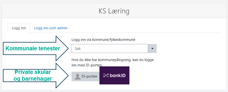 NB! Innlogging via ID-porten for private barnehagar og skular fungerer berre fram til nyttår 2025 pga. at KS Læring då skal gå over til ei ny plattform. Kommunen vil jobbe for å finne ei ny løysing på den nye plattforma.