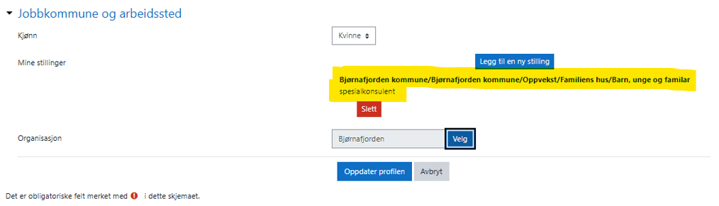 Tilsette i kommunale tenester må sørge for å vere registrert med korrekt stilling og arbeidsstad under «Profil» på «Min startside» ved å følge stega under.
