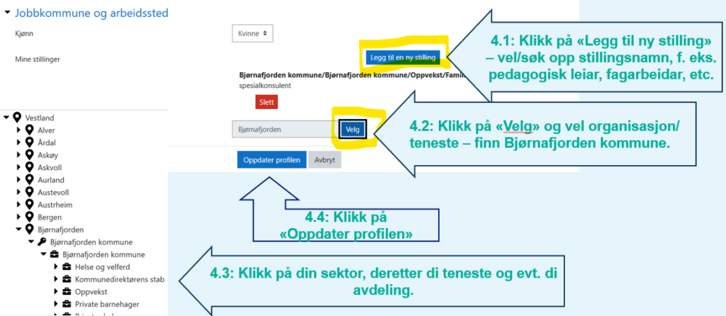 3. Sjekk om du er registrert med korrekt stilling og arbeidsstad, eventuelt legg til eller korriger stilling og arbeidsstad. For nærare skildring, sjå bilde og følg stega i punkt. 4.